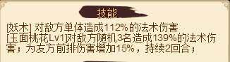 玉面桃花,对敌方随机3名造成139%的法术伤害,为友军前排伤害增加15%,持续2回合。
