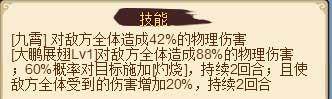 大鹏展翅:对敌方全体造成88%的物理伤害,60%概率对目标施加灼烧,且使敌方全体收到的伤害增加20%。加伤和灼烧持续2回合。