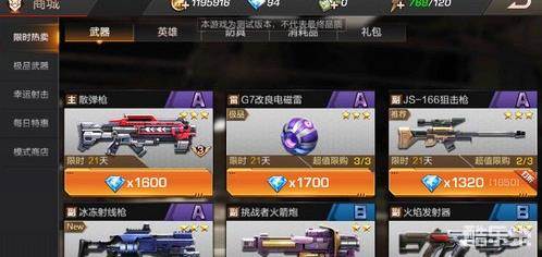 限时热卖的钻石场是个可以直接购买成品的地方,目前拥有武器,英雄,防具,消耗品,礼包;武器中目前仅仅销售紫色A品质散弹枪,紫色A品质G7改良电磁手雷,紫色A品质JS-166狙击枪,紫色A品质冰冻射线枪,其余的为蓝色B品质武器。除了系统登录赠送以及VIP礼包产出的散弹枪外就剩下直接购买了,虽然精英关卡也会产出散弹枪但是那是精英第六章以后才会开启,至少需要玩家等级超过50级才能打,因为玩家等级达到50级才开启剧情第六章前两个普通关卡,此外紫色A品质G7改良电磁手雷的产出也是整件,对比另一个G7改良手雷来说这个电磁雷的产出要产出要多的多,其他武器的获取显得不怎么必要了;