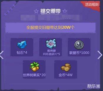 5、以上三个活动中获得的绷带可以提交,当全服提交的绷带数量达到20W个,本服务器所有的玩家都可以获得:钻石*4、雅典娜冈布奥碎片*5、联盟币*1000、世界树果实*20、金币*4W