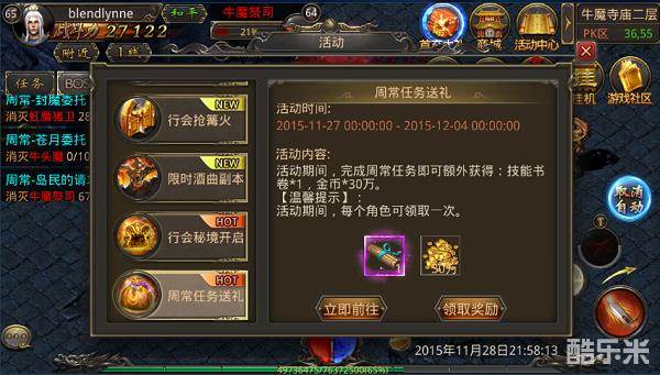 再者,目前有一个限时活动,“周常任务送礼”。在11月27号到12月4号之间,只要玩家们完成了周常任务,就可以获得技能书卷*1和50万金币的奖励,所以何乐而不为呢?