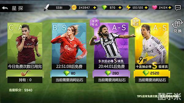 球探是获得球员的主要途径。球探分为4个等级,使用球探需要消耗球探道具。球探道具分为四种:初级球探、中级球探、高级球探、金牌球探,球探道具可以在系统活动领取、星级宝箱、等级礼包领取、钻石购买等等方式获得。绿色的为免费抽卡,每天5次,玩家可以每天从这里获得5个球员,有概率会出紫卡,小编在第一次抽的时候就直接获得了一张紫卡,对于前期来说会帮助很多,前期玩家的11人阵容都是C卡,所以这5个免费的抽卡,上线后玩家一定要抽取,即使不能上场,也可以用来当做球员卡升级经验卡来用。第二个是中级球探道具抽卡,需要消耗80个钻石,不建议把钻石用在这里进行抽卡,因为感觉性价比不是很高,但是每天有一次免费的抽取机会,有一定的概率能出金卡、紫卡,第三个是高级球探道具抽卡,需要消耗280钻石,能出A-S等级的卡牌,新手引导有一次免费抽取,获得紫卡托雷斯,托雷斯只紫卡里面战力最高的,他的战力相当于一个巨星金卡的水平,所以系统送的第一张卡是非常好用的,后面的升级,升星,升阶相对于金卡来说都更容易,但是数值却和金卡差不多,对于前期来说,玩家需要大量的A卡和金卡先把自己的阵容稳定,所以选择高级球探抽卡是比较合适的,高级球探抽卡十次必出金卡,最后一个金牌球探抽卡,也就是十连抽,十连抽能出十张卡,至少能出一张金卡,当然有时候能出两张甚至三张,要看运气了,十连抽是一个非常划算的抽卡,但是对于非R玩家来说,前期钻石获得很少要等2800钻石是非常辛苦的,而且没有足够多的高等级卡牌打副本也会变得更加辛苦。大R不用考虑这个问题。