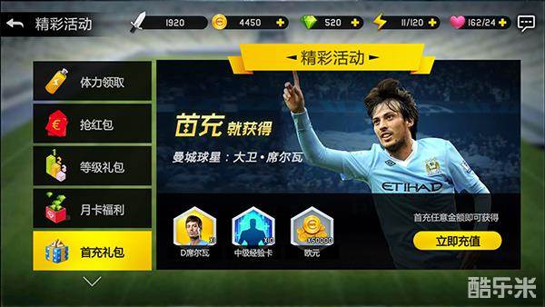 (2)、首充礼包可以获得大卫席尔瓦,首次充值任意金额,就可以获得一张金卡,一个中级经验卡,50000欧元,这是相当划算的。