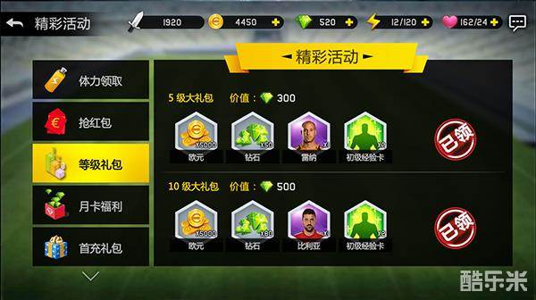 (3)、等级礼包获得门将雷纳和前锋比利亚,游戏前期升级比较快,能很快领取到这两个球员。