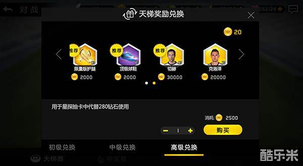 (5)、天梯积分可以兑换到球员,初级兑换:多斯桑托斯,中级兑换:特里,高级兑换:切赫,克洛泽,在这里获得的球员对后期的升级、升星、升阶会很有优势,因为每天都有固定的积分奖励,能够固定产出,所以这几个球员都是非R、小R很好的选择。