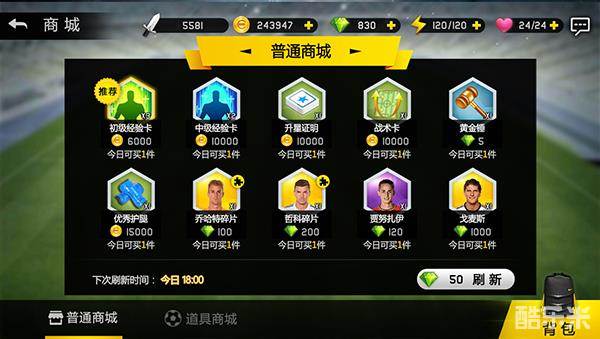 (6)、商城中通过刷新购买球员碎片或者球员获得球员,商店刷出的碎片小编不建议大家去买,1是因为价格贵,2是刷新有概率很难合成一个球员,当然背包已经有球员碎片,就差几个,可以在商城里试试运气,球员的话,战斗力越高的球员越贵,一个大师级别的球员价格得2500钻石,而十连抽的价格是2520,所以这种超级贵的球员,除非自己非常喜欢,要不是不建议去买的,1000钻的巨星金卡,和100钻的紫卡,前期是可以入手的,这个还是比较划算的。