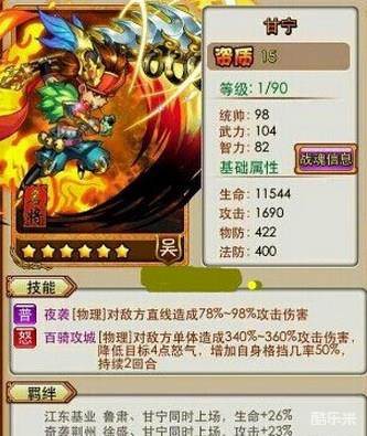 橙卡甘宁这次更新中规中矩,对蜀国来说,吴国前排更肉了(话说甘宁百骑破的不是魏国的营吗?)但是,甘宁怒技的提升并不是非常之大,从70到90,数据上很好看,但是如果把武将自带和书马算进去,大家会发现,并没有蜀国关羽提升的大,好吧,其实也不错了,但是终极天赋就没看懂了。。。
