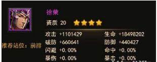 徐荣的攻击有有110W,血量1849W,破防66W,防御44W。
