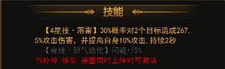 技能四星落雷,30%概率对2个目标造成267.5%攻击伤害,提高自己10%攻击持续2秒。
