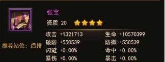 张宝,拥有132W的攻击力,1057W的生命,破防与防御都是55W。