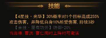 四星技光华:百分之30%概率对单体造成255%伤害,并降低自己10%所受伤害持续3秒。