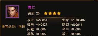 曹仁的属性就是这样了,坦的可怕。我只能说。血量超高,防御超高。这真的是一个四星角色么?