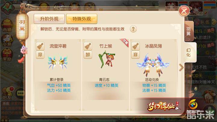 另外,游戏中还有更多特殊翅膀,如流萤淬碧、灵耀九天、火凤涅槃、暗夜假面、竹上猴等。不同的翅膀获取的方式不一样,如冰晶风翎可以通过攒秘宝之匙兑换,最快1个月就能拥有。冬季恋歌翅膀可以在晚间活动中获得碎片,之后进行合成。竹上猴在青云志精英第七章通关时可直接领取。铃铛羊用积分换碎片,碎片再合成就能拥有。