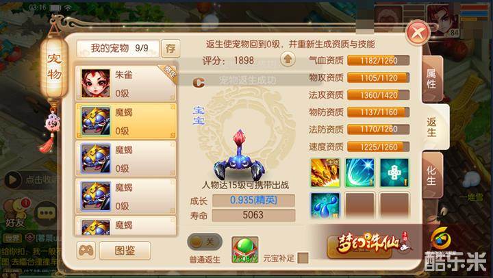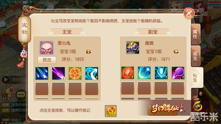 化生对于玩家们来说并不陌生:通过将两只多技能宠物进行化生从而让主宠的技能数发生改变;不过需要注意的是在化生过程中如果主宠可携带等级高于副宠那么化生结果会受到影响,所以这里玩家应将5级宠物当做主宠、10级宠物当做副宠来进行化生(并且出现重复技能时也需用技能书将其打掉,不然也会影响化生结果)。