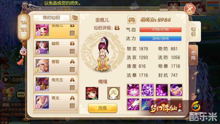 不过玩家在搭配纯输出性的阵容时还是建议让金瓶儿以及小白上阵,虽然这两位仙侣的品级都不高,但是拥有魅惑众生技能的金瓶儿有几率让被攻击的目标进入防御状态、拥有摄心技能的小白则有几率让被攻击的目标进入混乱状态,而玩家让她俩上阵之后才能够使纯输出的阵容不乏控制力(也只有这样才会减少意外的发生几率)。