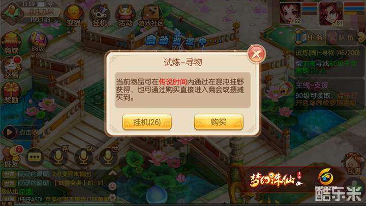 一部分玩家抱怨试炼难做的原因在于寻物任务需要耗费太多的资金去购买NPC所需的各类物件,从而一趟下来即使算上获得的奖励也是笔亏本的买卖。其实试炼的寻物任务最好解决办法就是通过在混沌时空挂机来获得任务物品,并且只要玩家在挂野的过程中队伍人数越多那么获得传说物品的几率也就越大,从而完成试炼任务的成本就会小上很多。