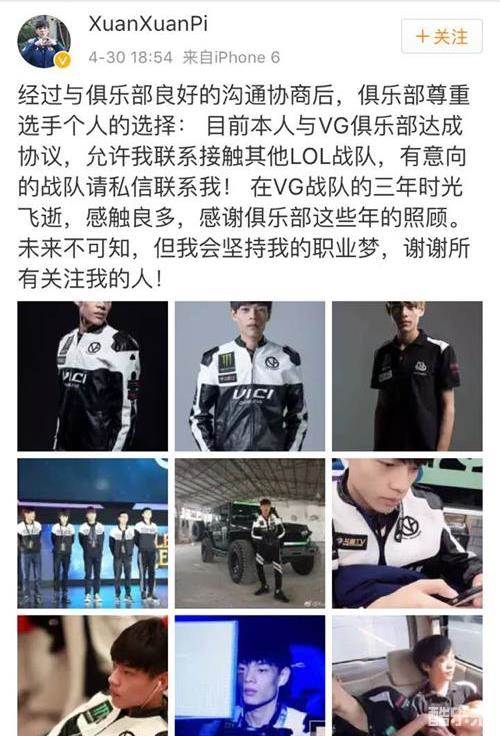 就在刚刚,VG战队AD选手XuanXuanPi发博表示:“目前本人与VG俱乐部达成协议,允许我联系接触其他LOL战队,有意向的战队请私信联系我!”