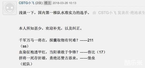 对于这位玩家的总结不少网友纷纷表示,楼主的文采太好了,就是有点中二病,不过要说这些选手,蛇队的堡垒还是算了吧,国外的表现有点让人失望,还不如队友来的亮眼一些。