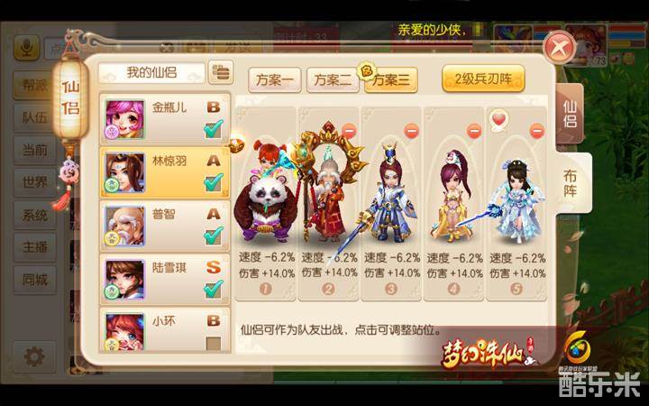 之所以上阵林惊羽是因为兵刃阵的提伤效果配合着开启了“九霄龙吟”特技的林惊羽能够在前三回合可打出海量伤害,而10级技能“碧光啸”提升团队速度的效果能够有效抵消兵刃阵的减速效果;至于上阵金瓶儿是因为其在输出的同时能够起到限制行动的作用(攻击附带压迫效果)、而拥有法术连击能力的陆雪琪自然是非上阵不可的。