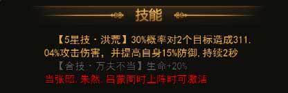 【五星技、洪荒】30%的概率对2个目标造成311.04%攻击伤害。并提高自身15%1防御,持续2秒。