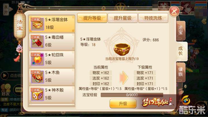 法宝经验对于玩家来说获得起来并不麻烦:在商会购买法宝灵髓即可将法宝进行升级,不过法宝的属性不仅与等级有关还与星级有关,所以这里建议玩家当法宝达到4星时再开始升级。至于法宝的升级顺序个人推荐优先升级浮屠金钵至顶级(攻击力无论是在PVP模式中还是PVE模式中都同样有用),接下来则是将獠牙升至顶级(毕竟在PVP模式中速度越快玩家就越占据优势),至于其余四件法宝倒没有什么讲究。