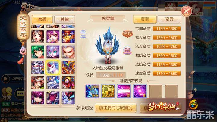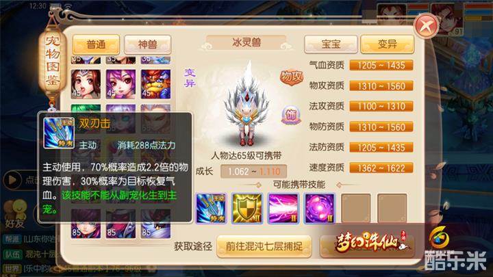 变异冰灵兽的属性资质也算可观:1435的气血资质使得它不会太过脆弱,而1560的物攻资质让它不虚魔兽青龙,至于1622的速度资质还能使它能够比青龙更快出手。所以培养一只高资质变异冰灵兽的作用并不比青龙差,并且在培养开销方面还要小上不少(极其推荐资金紧张的玩家培养一只)。