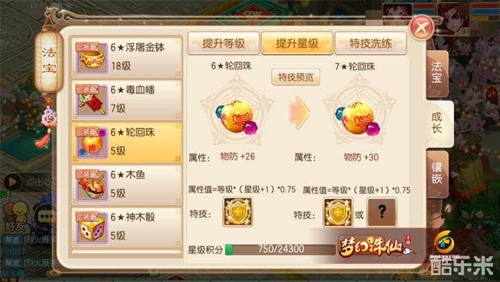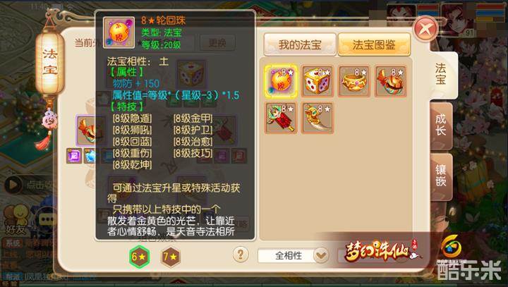 轮回珠作为土相性的法宝能够增加玩家的物防属性,从而培养高级轮回珠可以提升玩家对抗物理输出门派的能力(并且在日常的PVE玩法中物防发挥的作用要远超法防)。不过法宝的特点并不只是属性的增幅,当法宝在提升星级时还会解锁不同的特技效果,至于轮回珠的特技解锁顺序如下:隐遁→金甲→狮吼→护卫→回蓝→治愈→重伤→技巧→乾坤。