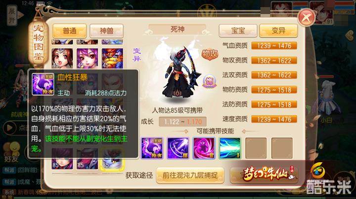 当玩家到达85级之后可携带三种新宠:制裁之剑、死神以及鬼巫;其中制裁之剑以及死神都属于物攻型宠物,不过相较于气血资质见长的制裁之剑而言死神的攻击则更加优异一些(其特技“血性狂暴”特别适合打输出),从而玩家在培养死神时“血性狂暴”是值得铭记的技能。