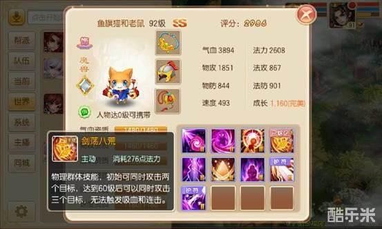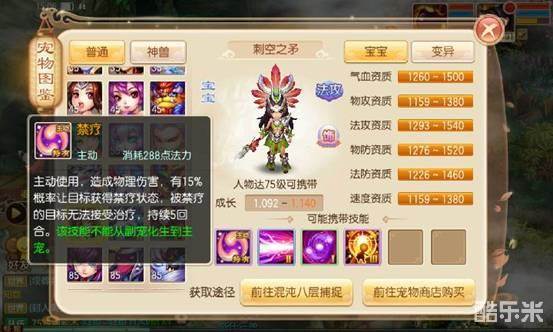 (2)法控血宠,这类宠物虽然也是体耐加点皮糙肉厚,但主要功能不是吃药了,而是打控制,注意是主打控制,不需要输出,技能格子最好在七个以上,核心技能会打上群法强迫毒药冰霜,再根据需要打上破防焕神毁镜之类的状态技能,有条件的可以打上迅捷,这类宝宝就不能要龟速了,最起码要比一般宝宝快。图下这只打技能的思路是正确的,只可惜选错了宝宝,喵太郎的速度资质实在太低。