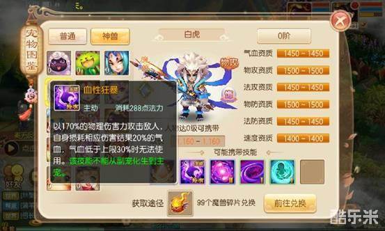 以虎人战士以及魔兽白虎和血性狂暴进阶版嗜血狂击小灰为例,加点一般为8力2体或者7力3体(不推荐全力),核心技能为血性狂暴(嗜血狂击)、金刚、重击、致命、技巧、偷袭、气势、吸血等等,化生最低要求为八技能,技能格子越多越好,此类宠物以扣除自己部分气血来对目标造成大量物理伤害,而自身气血低于一定程度则无法施展。首先这个技能的伤害非常之高,170%的攻击如果触发了暴击也许一下就可以秒掉对方的一只输出类的宠物,但缺点则是会扣除自身气血,并且没有隐身技能的保护,宠物自身的生存能力会大大降低,但因此换来的伤害能力却是相当可观的。