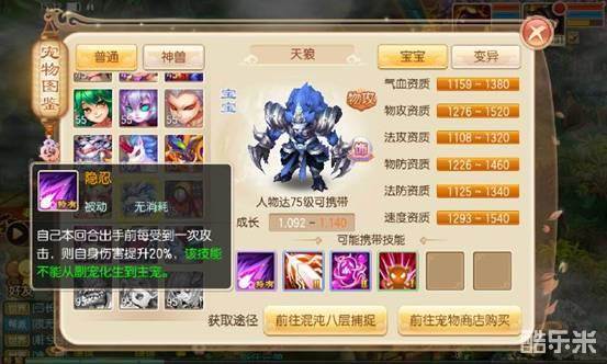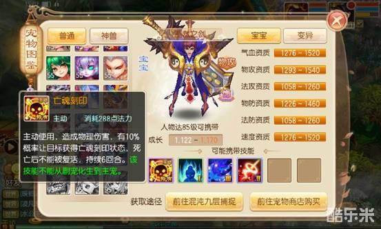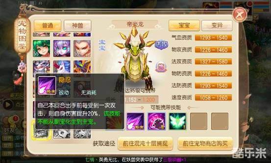 到这里兜妹必须要说了,一只十技能隐攻宠物简直是热衷于pvp玩法的少侠们的终极追求!!隐攻宠物七技能凑合,八技能一般,九技能极品,十技能完美!并且隐攻宠物是最为注重技能格子数量的,加点一般为全力,或者少量的敏捷。此类宠物的核心技能为隐身、连击、金刚、重击、致命、金睛。此外保命类技能重生鬼魅保命三选一,八九技能的话技巧、偷袭、强迫、审判、追击可以看个人喜欢选择。而完美的十技能则可以加上一个神技迅捷,保证比对方宠物先出手。推荐在高等级宠物如85级制裁之剑,95级撒旦之魂,以及物理魔兽和黄金兜兜还有小灰之间选择。比如图下这只就是比较完美的。