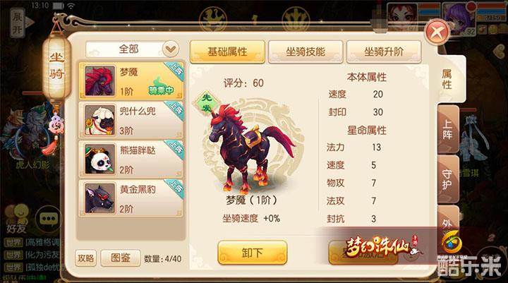 坐骑守护技能方面,也是尤为重要。1阶技能为轻巧,超级轻巧能给守护的宠物带来12%的速度加成,对于速度状态宠来说,非常实用。3阶技能是致残、压制、遁甲和御法,分别对应物攻、法攻、物防和法防,按宠物需求选择相对来说是比较全面的。5阶技能为怨怒、虚空、伤痕、灵气,分别对应物理暴击率、法术暴击率、物理暴击伤害和法术暴击伤害,从坐骑技能上看,梦魇的比较适合速度宠。