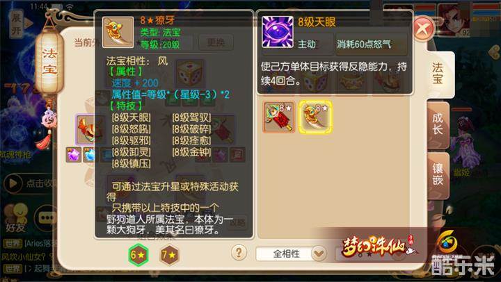 能够增加速度的法宝獠牙确实是玩家需要优先升级的对象,毕竟在竞技场中速度还是至关重要的。而獠牙的特技就不像其属性那样有多么的给力了,所以这里推荐非焚香玩家还是选择“天眼”特技比较好:因为现阶段游戏中隐身宠已经占了一半之数,如果玩家不具备反影能力的话会很有可能被对方的隐身宠靠喂养来翻盘。