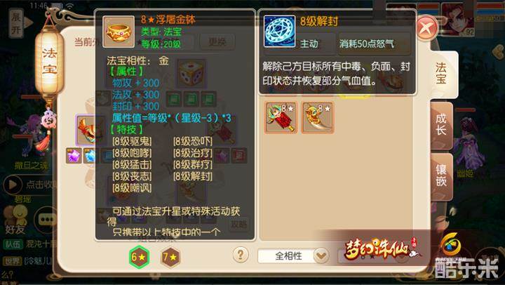 金相位的浮屠金钵对于玩家来说也是需要优先升级的法宝,其不俗的攻击力加成可以使玩家在各类玩法中都受益匪浅,不过在特技方面倒没啥亮点,虽然“解封”特技具有很好的效果但奈何拥有条件较高,所以这里建议物理输出玩家先行选择“猛击”特技凑合使用还是相当不错的。