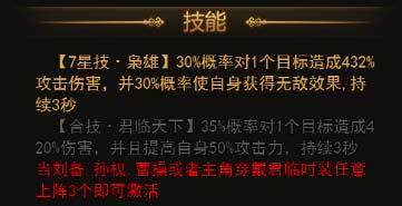 合技君临天下,35%的概率对一个目标造成420%的伤害,并提高自身50%的攻击力。