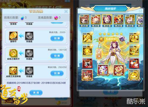 在本次活动期间,玩家参与《道友请留步》的各个玩法均有机会获得“琉璃石”,在装备升金活动界面中点击节日兑换,即可使用“琉璃石”兑换各类稀有材料,包括 金装之灵选择箱、化金丹、渡劫丹等等。开启金装之灵选择箱,可以任选一件上古神兵之灵,激发现有装备潜力,渡化升金,瞬间带来成倍的战力增长。