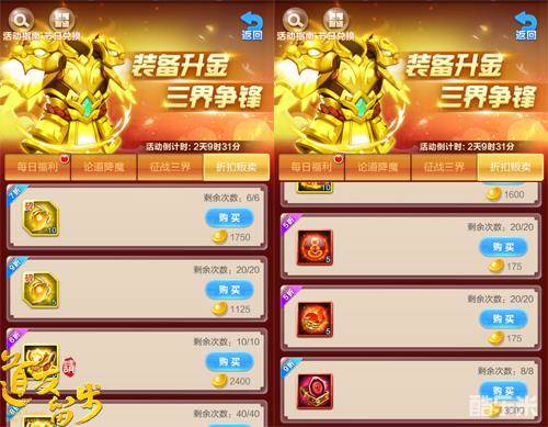 除了上述活动之外,本次装备升金专题还开放了折扣贩卖商店,最低低至五折,无需额外充值,使用金元宝即可购买。之前玩家在各种日常活动中囤积的金元宝,是时候拿出来秀一波了,一键升金让你爽到整晚都睡不着!