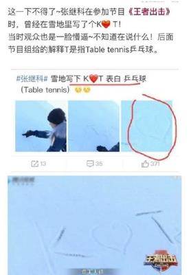 被自家粉丝看穿,这得归功于二人平日里微博间的频繁互动。不过张继科表白景甜这事儿,早在去年就有端倪。2017年,张继科加盟腾讯出品的一档真人秀《王者出击》,在最后一期的冰雪峡谷收官战中,张继科曾在雪地里写下“K❤T”,并对着摄像头强调,“拍这个,要播哦”,如今“Table tennis”摇身一变成了“Tian”~