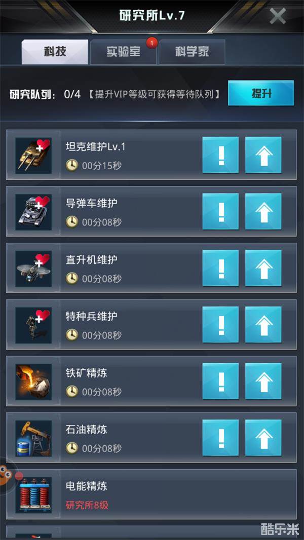 研究所共有16种科技,又分为三大类,分别是兵种类,资源类和发展类。其中兵种类就是提升各兵种的血量和攻击,每级提升5%,非常之高,后期如果你兵种科技高于别人,那么你的低级兵种能直接媲美人家的高级兵种;而资源类,顾名思义就是提升各类资源生产速度,为自身发展打下良好基础;而发展类则很实用,可以提高建筑速度,储藏量和经验获取。总的来说三种科技都很重要,如何抉择就要依靠指挥官自己来思考了。