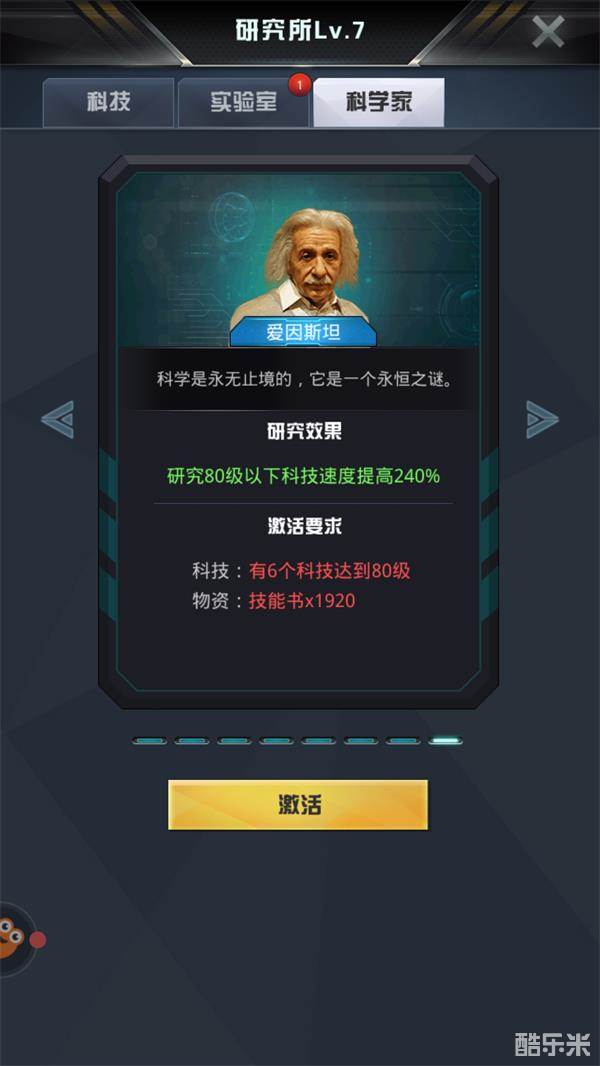 除此之外,我们还能在研究所里面招募科学家,加快我们的研究速度。其中各位科学家都是我们耳熟能详,名留青史的存在:诺贝尔,达尔文,霍金,爱迪生,爱因斯坦等等,相信有他们的帮助,我们的研究将更上一层楼。