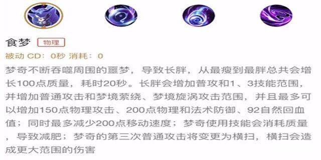 被动技能是梦奇的招牌技能,他的身形随着质量的增加而变大,相应的其攻击力、防御力和技能范围也会变高,作为代价,梦奇的移动速度会明显降低。被动技能是物理流梦奇的核心,虽然技能介绍里面说梦奇的攻击力最多增加150点,但这只是一级的数据,被动属性是随着等级而提升的,满级满质量的梦奇可以获得430点额外物理攻击力。所以,即使不出物理装备,梦奇的普攻伤害也是不容小觑的。除此以外,有质量梦奇的双抗也非常高,极大地提高了梦奇的抗打击能力。
