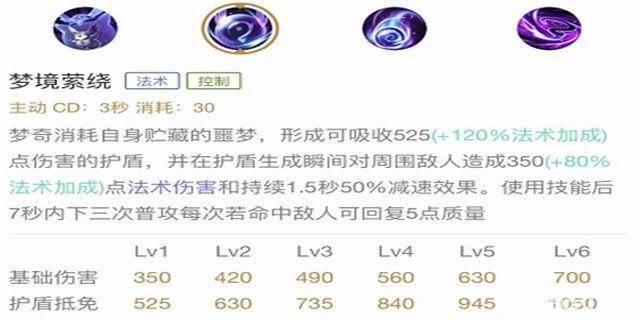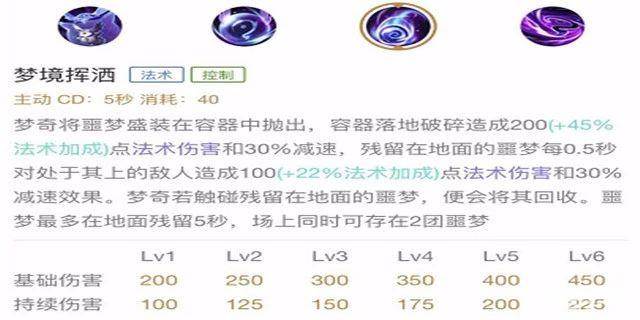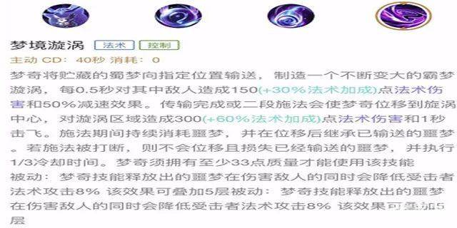 大招是梦奇的位移技能,梦奇向指定地点传送噩梦,噩梦持续对站在上面的敌人造成魔法伤害,持续时间越长,噩梦范围越大,完成输送后梦奇回复的质量越多,梦奇到达地点后可击飞敌人并造成魔法伤害。这个技能对敌人后排和残血敌人的威胁非常大,击飞和瞬间伤害配合上队友很容易将敌人击杀。被动效果是减少被梦奇技能命中的敌人的法术攻击,可以有效遏制敌人法师的输出。