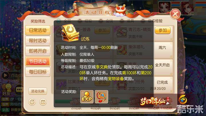 同样是50级开启的任务试炼则能够产出3、4级宠物装备,所以玩家不要忘了每周完成200环哟!不过在一些玩家的认知中试炼任务比较费钱,其实只是完成任务的姿势不对罢了,而这里就教给广大玩家一个小技巧:如果玩家不能在传说时间内获得需要的道具,那么在时间结束后可以先去购买一个,接着将道具存入仓库即会刷新传说时间,这样就可以光靠刷怪获得任务物品了!