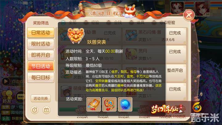 60级的妖兽突袭活动对于初开启的玩家来说难度不小,尤其是封系怪物着实令人头疼,所以这里建议玩家在战斗时优先集火名为“死神”“冰兽”的怪物,因为这两种怪会释放封印法术。而在击杀妖兽时建议玩家选择场景地图中的变异妖兽(爆率相对于普通妖兽要高),如果没有变异妖兽则可以在商会购买兽灵然后去南疆找兽神挑战妖兽(爆率依旧比普通妖兽高)。