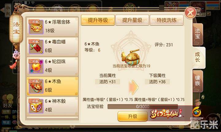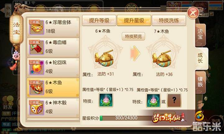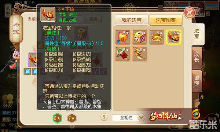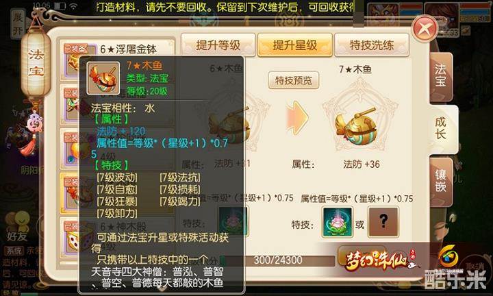 虽然木鱼的升星材料比较容易获得,但这里建议玩家在喂养法宝时还是遵循同级喂养的方式比较好,如果玩家一味用低星素材来喂养的话很容易出现星级被浮屠金钵反超的情况。不过玩家在给法宝升星的同时不要忘了提升等级,毕竟法抗属性还是蛮有用的。。