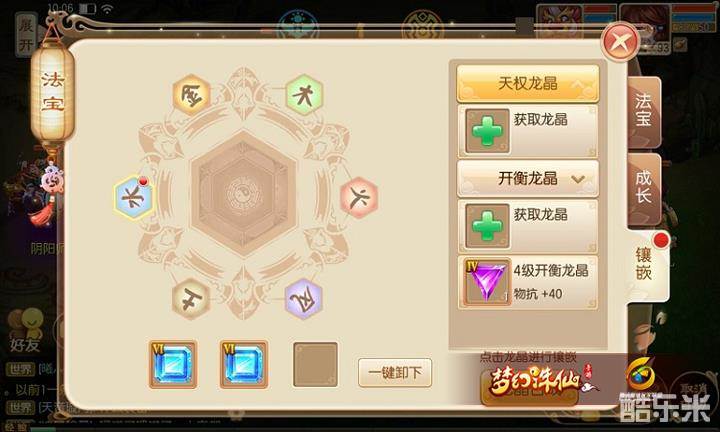 玩家在水相位可镶嵌的龙晶有两种:增加物防的天权龙晶以及增加物抗的开衡龙晶,虽然全部镶嵌天泉龙晶最为实用但两天权一开衡的搭配方案更加经济实惠。