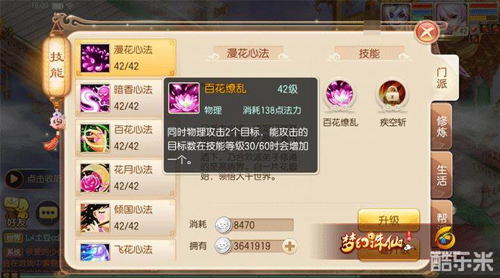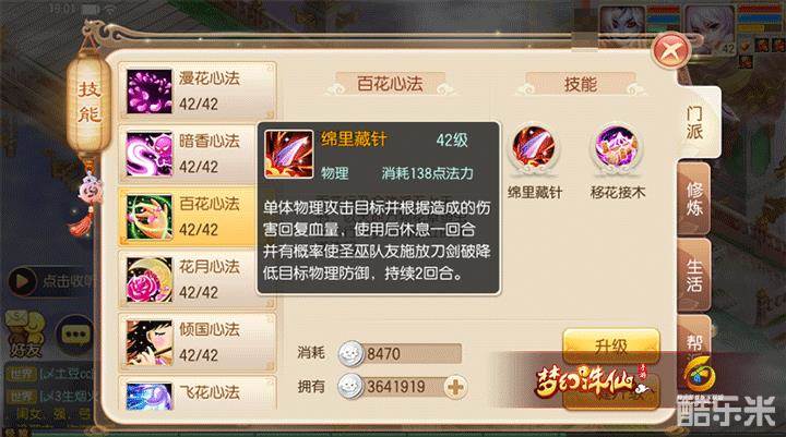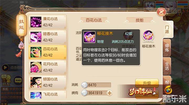 使用移花接木同时物理攻击2个目标,能攻击的目标在技能每提升30级时就会增加一个目标,但在使用后会休息一回合。乍一看觉得并没有什么问题,再让我们对比一下另一个多目标性的技能一百花缭乱。