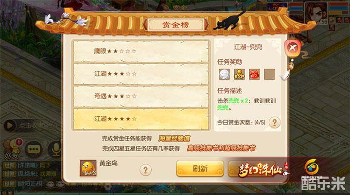 赏金任务对于玩家来说不仅可以提供可观的经验、银币奖励,高星的任务更能带来海量的金币收益,所以这里建议玩家接取三星及以上的任务,而在处理四、五星任务获得的技能书时建议玩家保留超级书,至于低级、高级技能书还是卖掉为佳!并且在使用黄金鸟刷新任务时切勿盲目追求五星,点到为止才合理。