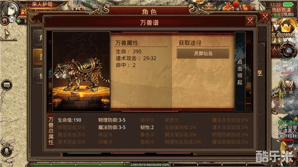 逐天莾虎的万兽属性偏重道士玩家,在万兽谱中,逐天莾虎可以为玩家提供390点生命值加成,29-32的道士攻击加成以及2点命中加成。