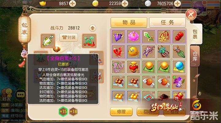 也就是说,如果你全身装备为90级,启灵15可以增加630气血、180物攻、180法攻、180封印、90物防和90法防,虽然套装给与的战力增加并不明显,但属性非常实用。